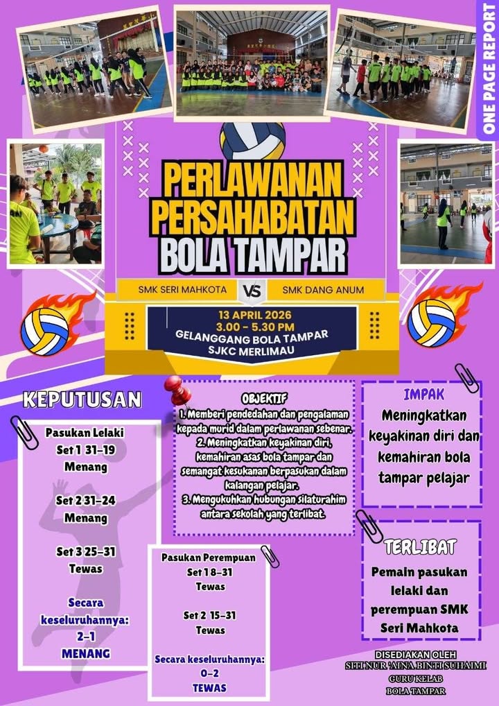 Tahniah dan syabas diucapkan kepada semua pemain bola tampar **SMK Seri Mahkota** yang telah menunjukkan semangat juang yang tinggi dalam Perlawanan Persahabatan menentang **SMK Dang Anum** pada **13 April 2026** yang lalu. ????????
